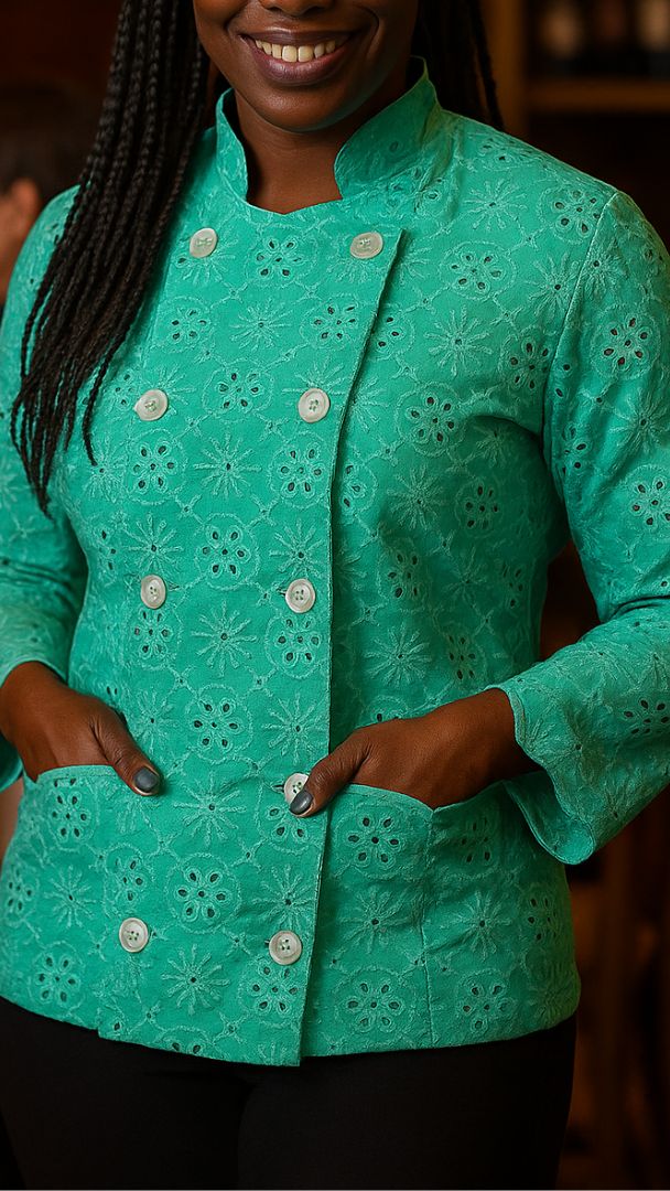 Dolmã feminina de laise verde água. Possui amarração na cintura na parte traseira da dolmã.