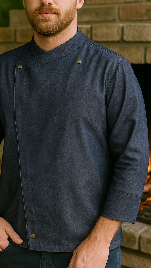 Dolmã unissex, de botão de pressão. Tecido Jeans. Manga 3/4.
